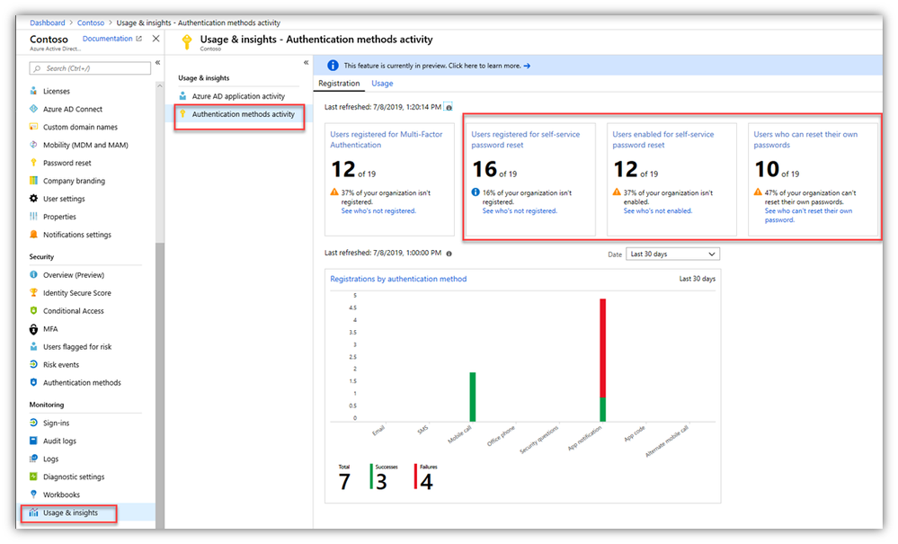 - ...and this one is HOT OFF THE PRESSES – the Azure AD ‘Usage and Insights’ reporting for Authentication Methods activity can show you who is/is not SSPR and/or MFA registered/enabled