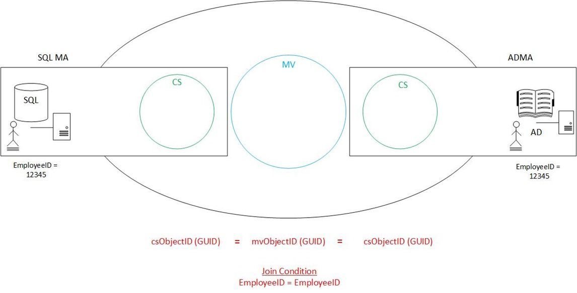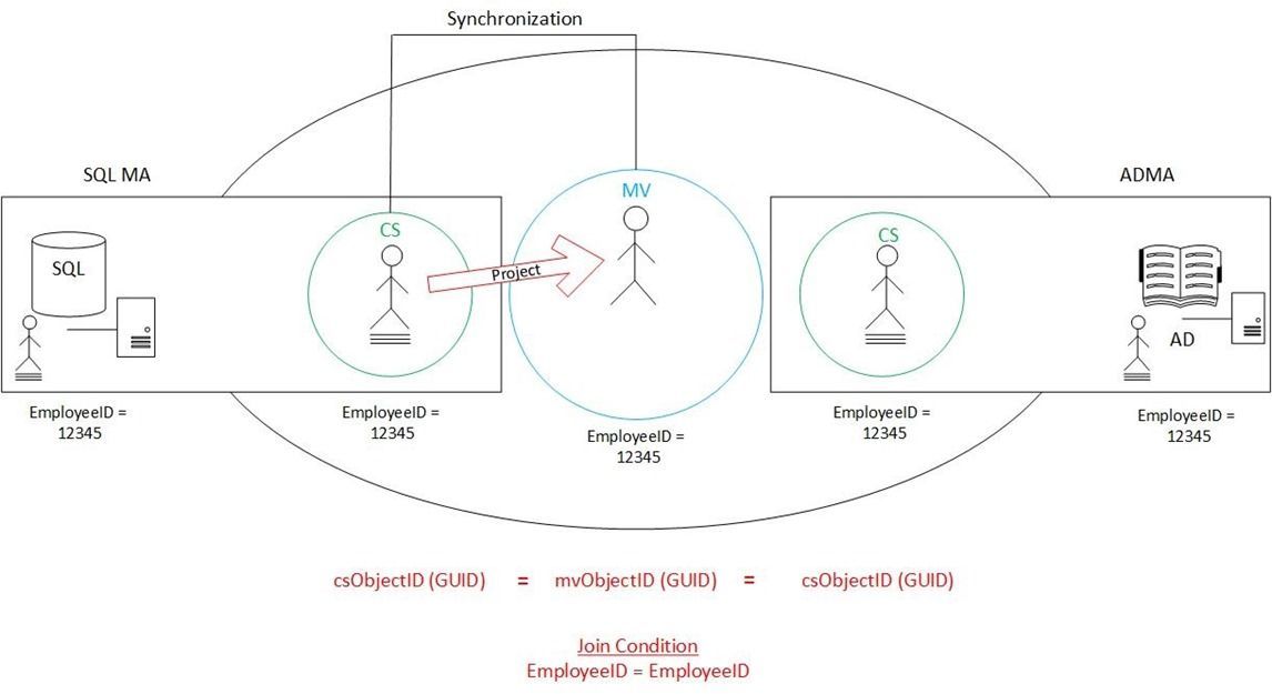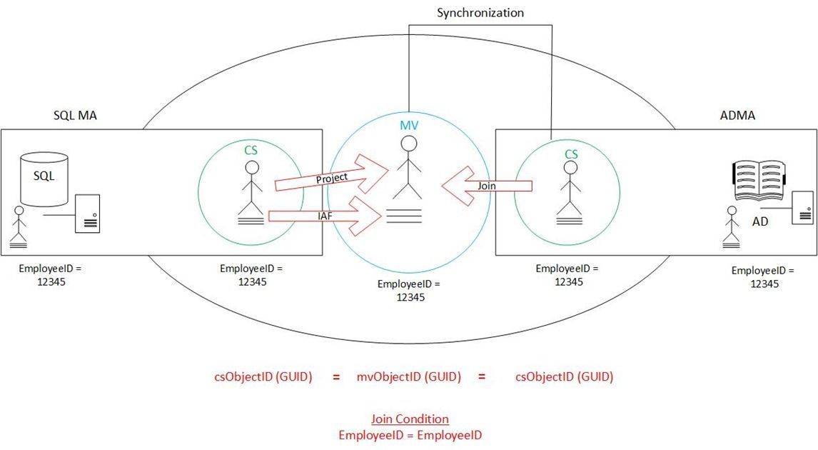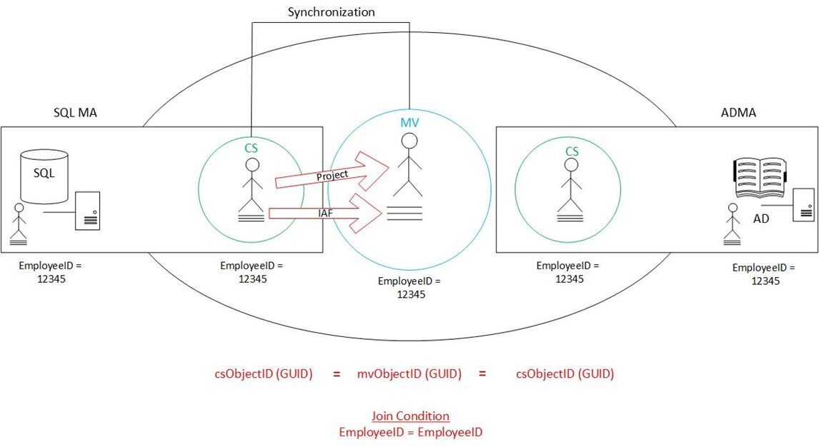 Here’s how it works: The user object is currently sitting in the Metaverse. Of the populated attributes, one of them is the EmployeeID . In this case, EmployeeID=12345 . When a synchronization is run on the AD management agent, the filter/delete step is passed over and it attempts a join. During this attempt, the AD management agent contacts the Metaverse and basically says, “Do you have a user object with EmployeeID=12345 ?” The Metaverse, naturally, responds in the affirmative and the two become joined together.