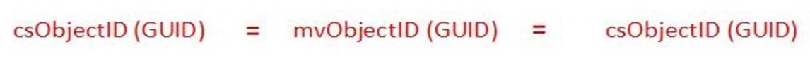 I also previously mentioned that once a join has occurred (or FIM has provisioned an object, in the case of new objects), a relationship criteria then exists. Once an object has been created in a connector space, it receives a unique ID, known as the csObjectID . Likewise, once an object has been created in the Metaverse, it receives an mvObjectID . Once an object has passed all the way through FIM (from source connected data source, through the Metaverse and into the target connected data source), these values are created and an association is made. A visible representation of this would be: