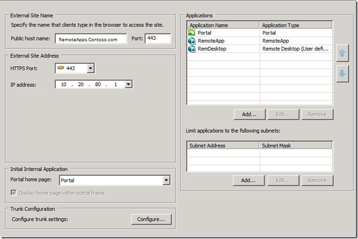 As you can see, my configuration was pretty simple. I started with a basic UAG portal and then added the RemoteApp and Remote Desktop applications through the Add Application wizard.