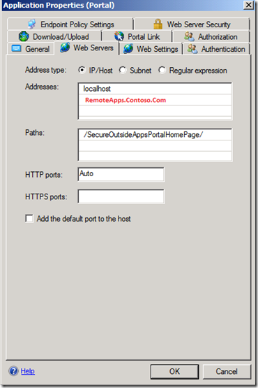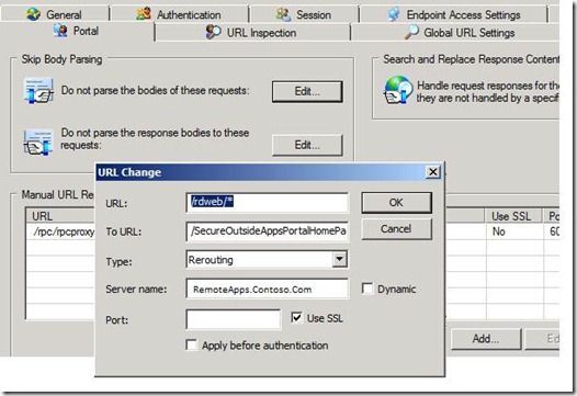 Unfortunately, there was one caveat, we had to be able to handle the existing documented and saved favorite URL for https://RemoteApp.Contoso.com/RDWeb . At first glance, I thought of a few different ways to do this, but it turned out that it wasn’t quite as straightforward as I had envisioned. After some research via http://www.bing.com I read several posts that said this can’t be done with various reasons why. It happens to early in the ISAPI handling from the UAG application was the one that stuck in my mind. This seemed like something that would have been thought about with UAG, and I felt that there must be a way to accomplish something as rudimentary as redirecting an inbound request to the main portal page.