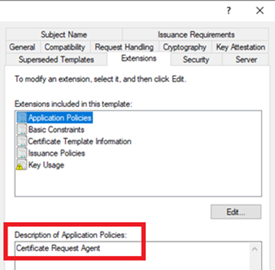 All certificate templates from the list above are version 1 certificate templates. Number 1 and 2 share the common characteristic of having the Extended Key Usage (EKU) extension set to include the OID 1.3.6.1.4.1.311.20.2.1, which corresponds to “Certificate Request Agent”. In this article template number 1 and 2 (from the list above) will be referred to as “NDES Enrollment Agent certificate(s) templates”.