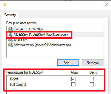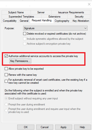 In case the SCEP AppPool is configured to run in the security context of a domain account, you must grant READ access to the private key to the NDES service account. Otherwise, no changes are required on this tab.