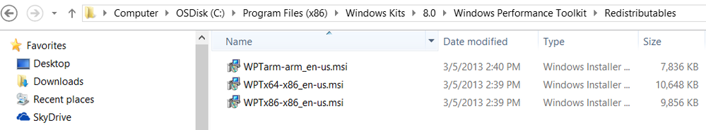 By default, the Windows Performance Toolkit installs to C:\Program Files (x86)\Windows Kits\8.0\Windows Performance Toolkit. If you wanted to install to an alternate machine, you can use the redistributables under C:\Program Files (x86)\Windows Kits\8.0\Windows Performance Toolkit\Redistributables. One cool thing to notice is the redistributable for ARM 🙂 which means you can install the toolkit on tablets\notebooks running Windows RT.