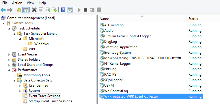 system issues and performance data. The general profile uses the NT Kernel Logger Collector as well as the WPR_initiated_WPR Event Collector. You can see this in action when a trace is running by going to Data Collector Sets\Event Trace Sessions. There you will see those two collectors running.