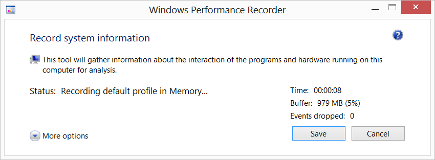 Also, if you have 24 gigs or more of memory, it might be better to use the following general profile: C:\Program Files (x86)\Windows Kits\8.0\Windows Performance T oolkit\SampleGeneralProfileForLargeServers.wprp. Systems with large amounts of memory will consume larger amounts of nonpaged pool(buffer). This profile uses less memory then the default general profile.