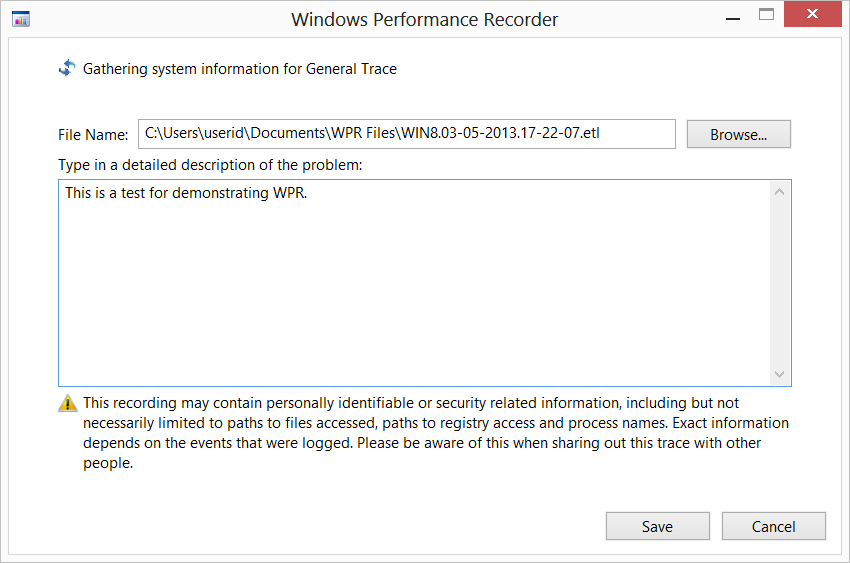 We now save the traces under the user account conducting the recording under Documents\WPR Files.