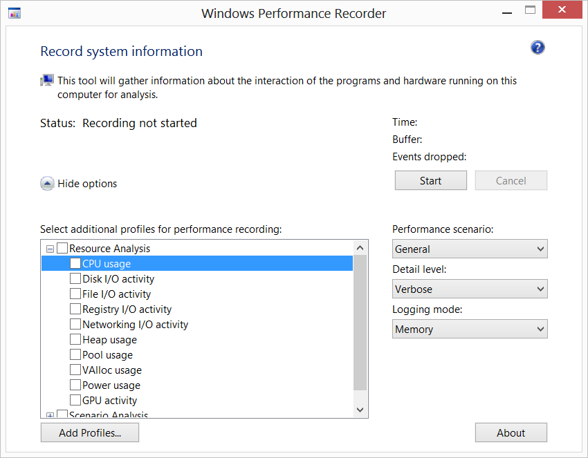 Note: For any boot, fast startup, shutdown, rebootcycle, standby/resume, and hibernate/resume scenario, WPR will ALWAYS log to a file. You cannot change this in the GUI.