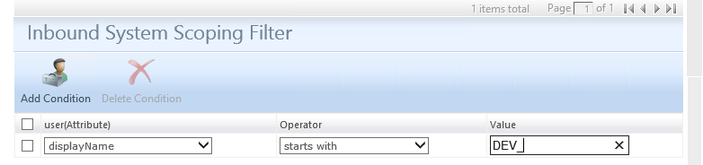 Now notice the Inbound Scoping Filter option, This could be used to filter out all objects that don't meet the defined criteria. This filter is INCLUSIVE which means only objects that match the defined criteria will be synchronized (Managed) via this sync rule. for example if the filter was set to displayName starts with DEV_ than only user objects that have a displayName that starts with DEV_ will be Synchronized with this sync rule.