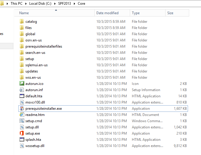 For this posting at the Root of C i Created a Folder called "SPF2013" which i copied all the SharePoint Prerequisite files. Within the "SPF2013" Folder i created a folder called "Core"  ( C:\SPF2013\Core )