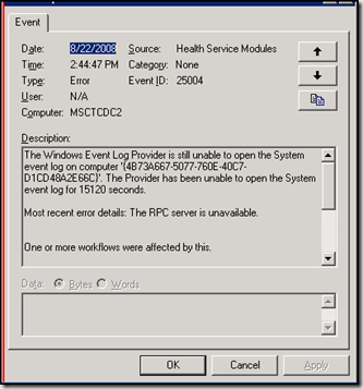 After installing the latest DHCP MP customers are seeing an issue where the event log cannot be opened on the DHCP systems. An event similar to the following is logged
