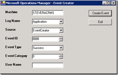 OK, everything is setup – time to test things out. As mentioned above I have a sample alert rule that will trigger on an event 8888 – I use Event Creator from the MOM 2005 resource kit to create that event in the application event log.