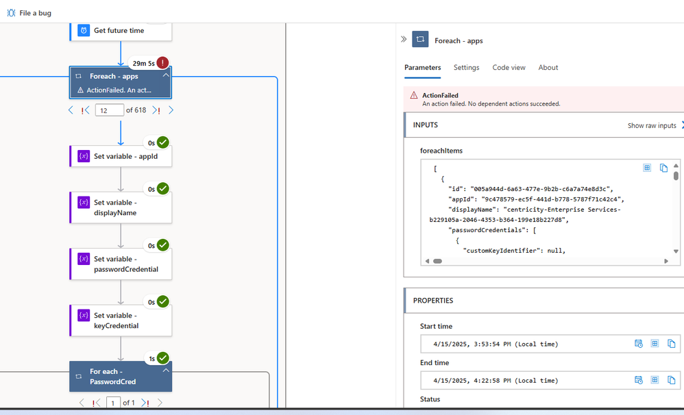 Next a Foreach – apps loop will use the value array returned from the Parse JSON step of the API call to take several actions on each Azure AD application.