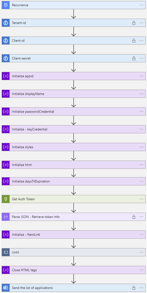 Initialize variable (String) – html – this creates the table headings and rows that will be populated with each of the Azure AD applications and associated expiration info.