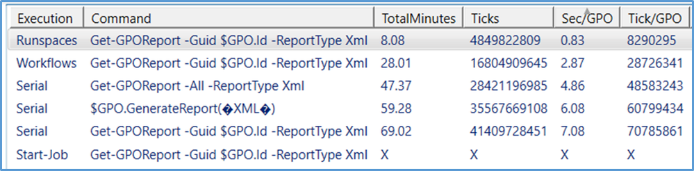 Here's my results, after retrieving over 500 GPO reports using the above methods; you can see Runspaces were the clear winner. Now that we have all the reports stored in a variable, I can answer my customer's question. I will create a hashtable that has the GPO name with the value set to all of its RunOnce GUIDs. I find these by parsing the report string for "FilterRunOnce" and then do some string manipulation using the Split() method.