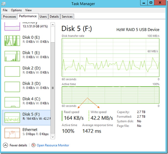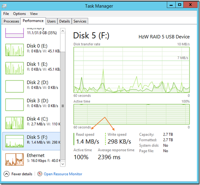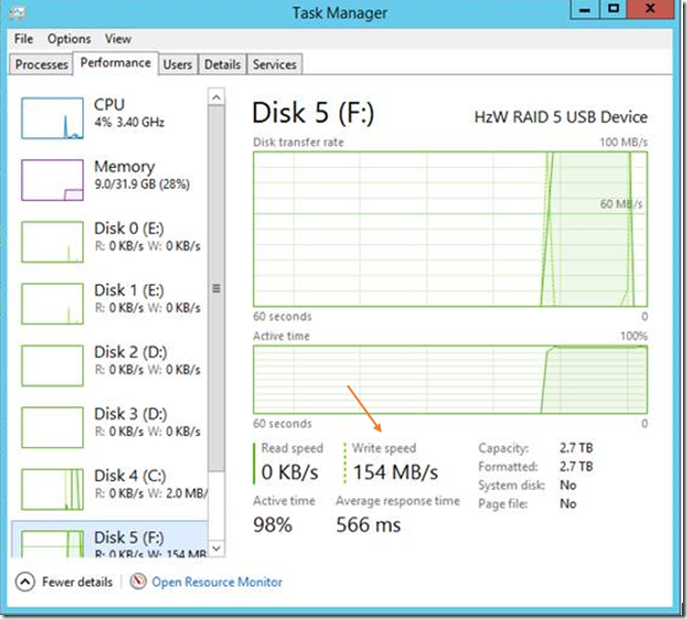 The other day I was implementing in my lab a pure Microsoft VDI solution (blog coming soon) leveraging the latest and greatest Hyper-V on Server 2012 R2. While doing so, I noticed I was getting abysmal performance coming from a four disk enclosure of RAID class prosumer hard drives. The enclosure was configured to use hardware RAID 5 and connected over USB 3.