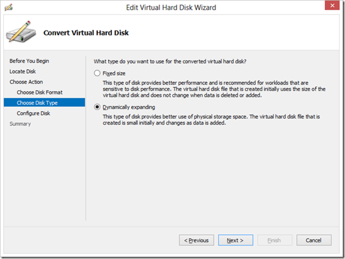 Convert-VHD [-Path] <String> [-DestinationPath] <String> [-AsJob] [-BlockSizeBytes <UInt32> ] [-ComputerName <String[]> ] [-DeleteSource] [-ParentPath <String> ] [-Passthru] [-VHDType <VhdType> ] [-Confirm] [-WhatIf] [ <CommonParameters>]