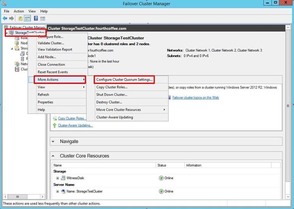 Well, most failover clusters do have a witness disk and here lies a quick method of getting storage testing performed. The witness disk since Server 2008 has been different from what clustering had in its quorum model in Server versions 2003 and older. In those legacy clusters the cluster could not survive the loss of the quorum disk but a 2008 or newer cluster can lose it and keep right only providing high availability. Now, the method I'm going to provide instructions for shortly won't provide the 'best' storage test results but it will provide you a quick, safe method to get 'some', that may be better than taking your cluster out of production or having to have a storage team carve out and assign a piece of storage for you. The following method requires just a few clicks of the mouse. To mitigate the slight risk involved here one could just 'change' the quorum model to a File Share Witness instead until after the storage validation tests are complete and then change it back to a disk witness. I'll put a link in the directions below to FSW configuration at the time you would need to configure it.