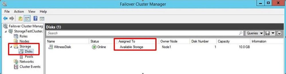 - In Cluster Administrator select Disks in the navigation pane and verify the Disk Witness disk has been returned to Available Storage.
