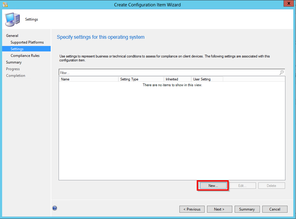 Click 'Add' to create a new Setting – you repeat this for each setting you want evaluated as part of this Configuration Item
