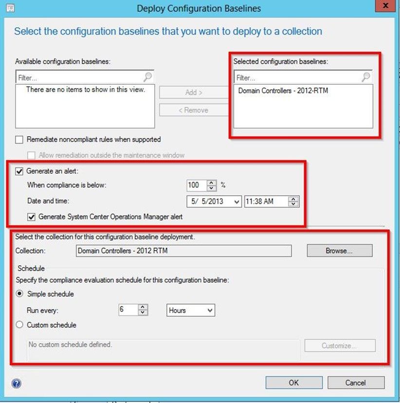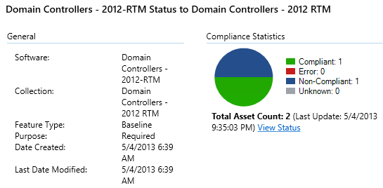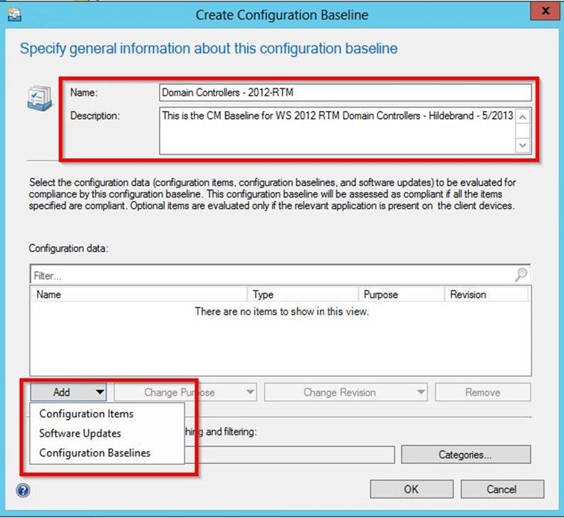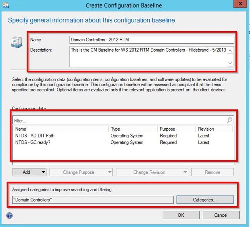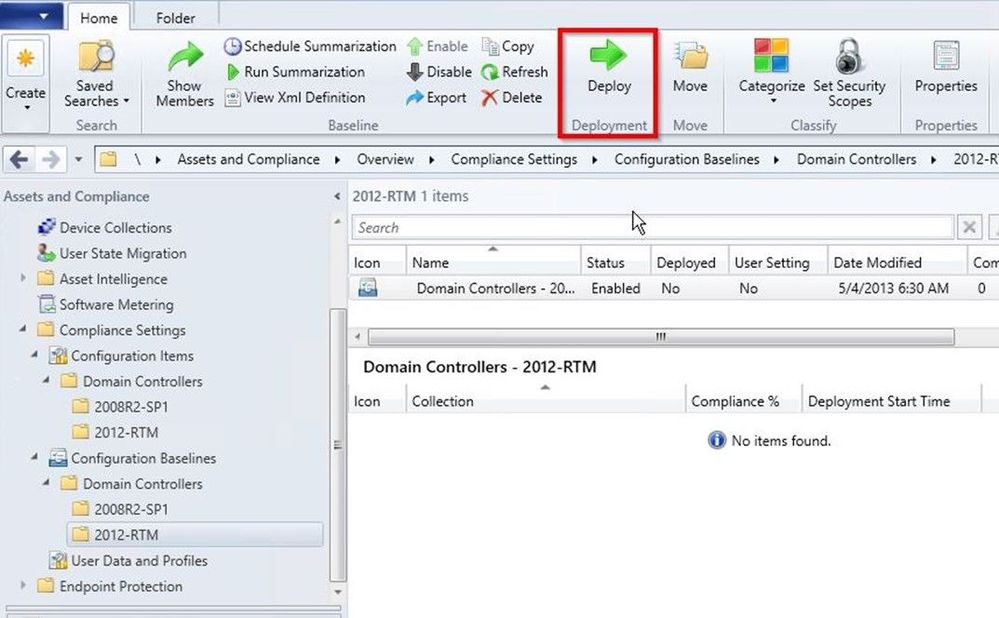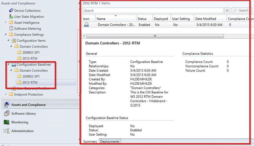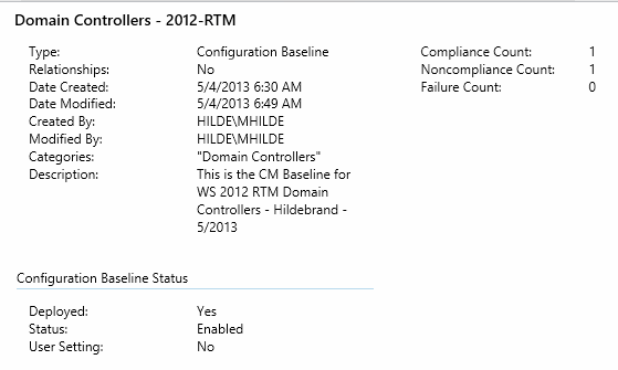 Click OK to complete the Configuration Baseline creation; notice towards the bottom "Configuration Baseline Status" – "Deployed: No"