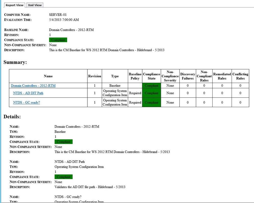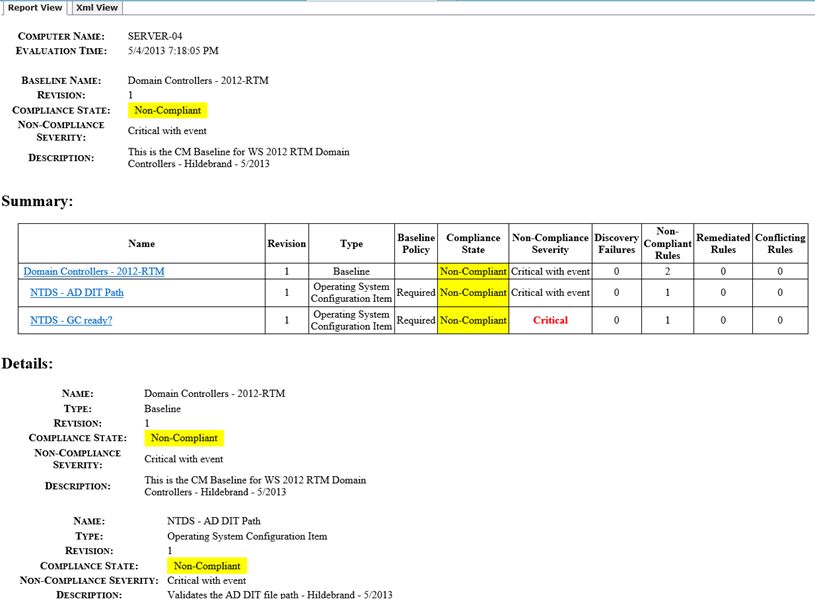 Step Six – Pick-up sticks. Then, after your ConfigMan infrastructure and Agents have refreshed, you can check the individual systems and get a nice local Compliance Report and/or use the CM Console/Reporting