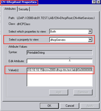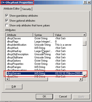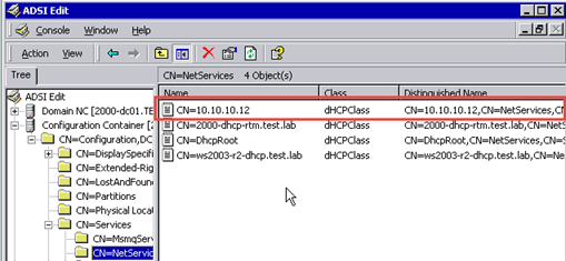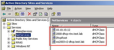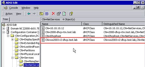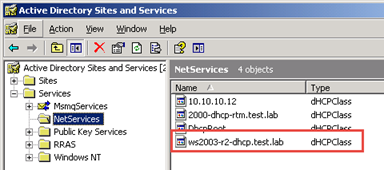 In the screen shots below, notice there is an entry for all three DHCP Servers under NetServices but there is only an entry for the WS 2000 DHCP server in the dhcpServers attribute of the DhcpRoot object – neither the Windows Server 2003 nor Windows 2003 R2 DHCP servers registered a record there.