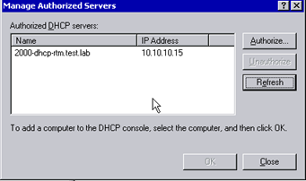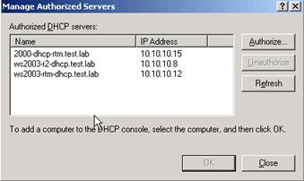 In the Windows 2003 DHCP Server service, the DHCP authorization process would write a record directly under NetServices but not add an entry in the dhcpServers attribute of the DhcpRoot object under NetServices.