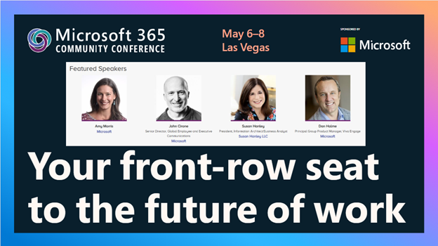 Microsoft 365 Community Conference, it’s not just for IT and product leaders – it’s the premier event for executive and employee communications professionals using the Microsoft cloud featuring Engage, SharePoint and Microsoft Viva. You will join industry experts, product leaders, and hundreds of peers from across industries and geographies.