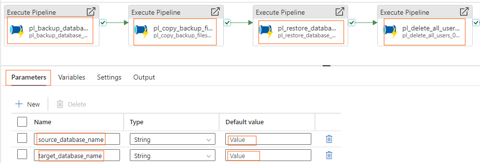 - Set up parameters for both the source_database_name and target_database_name to enable dynamic operation of the pipeline across different databases.