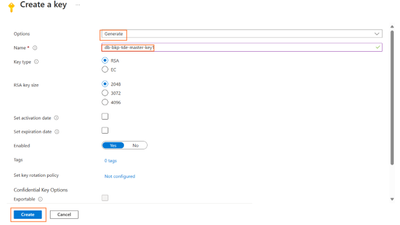 Name the key, select RSA with a 2048-bit key size, and leave the active and expiration dates unset for this demonstration. Ensure the key is enabled, and do not set a rotation policy. Finally, click Create.