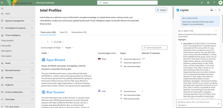 A brand-new Copilot for Security sidecar experience in the threat intelligence blade of Microsoft Defender XDR enables users to quickly query and summarize the powerful threat intelligence, security data, and other content available within the Intel Profile, Intel Explorer, and Threat Analytics tabs to add crucial context to incidents and investigations.