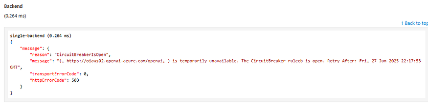 O evento nos diz exatamente: qual backend foi isolado (openapi01-openai-endpoint), qual regra foi violada (cb01), e por quanto tempo o circuito ficará aberto (15 segundos).