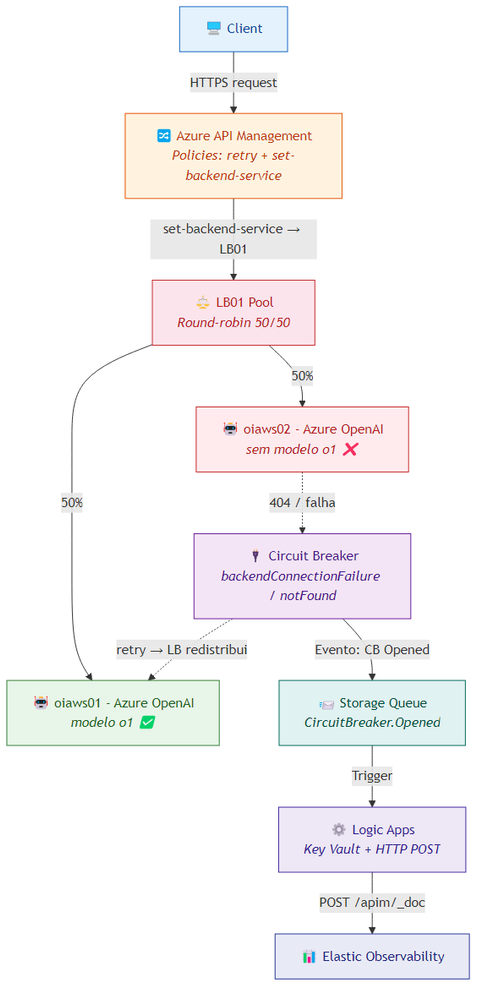 A combinação de Load Balancer + Circuit Breaker + Retry inteligente no APIM transforma uma arquitetura frágil em uma arquitetura resiliente — onde falhas em backends individuais são tratadas de forma transparente, sem impacto para o cliente.