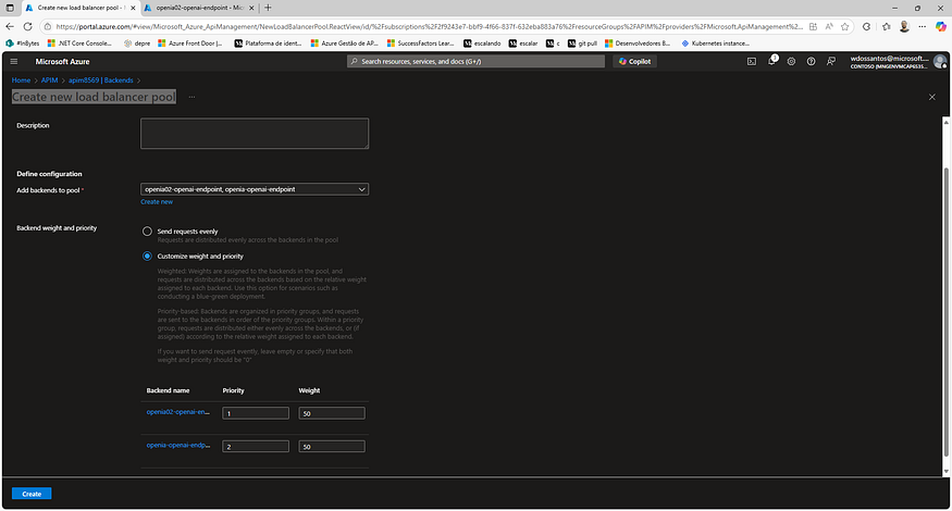O ponto de partida são dois backends do Azure OpenAI (oiaws01 e oiaws02), ambos configurados com Managed Identity. A partir deles, criamos um Load Balancer Pool no APIM, distribuindo o tráfego em um modelo 50/50 entre os dois endpoints.