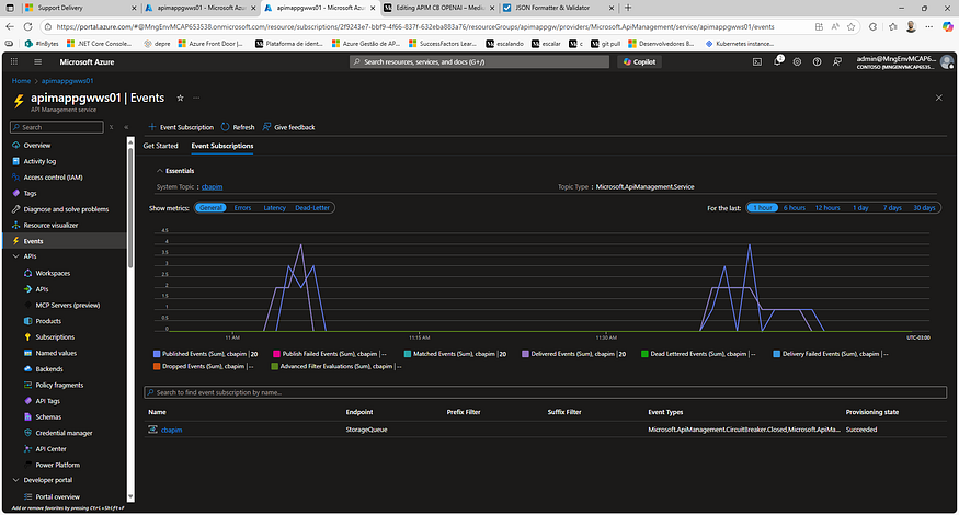 O APIM foi configurado para capturar eventos de abertura do Circuit Breaker e enviá-los para uma Storage Queue. Cada vez que um circuito abre, um evento é publicado com todos os detalhes relevantes.