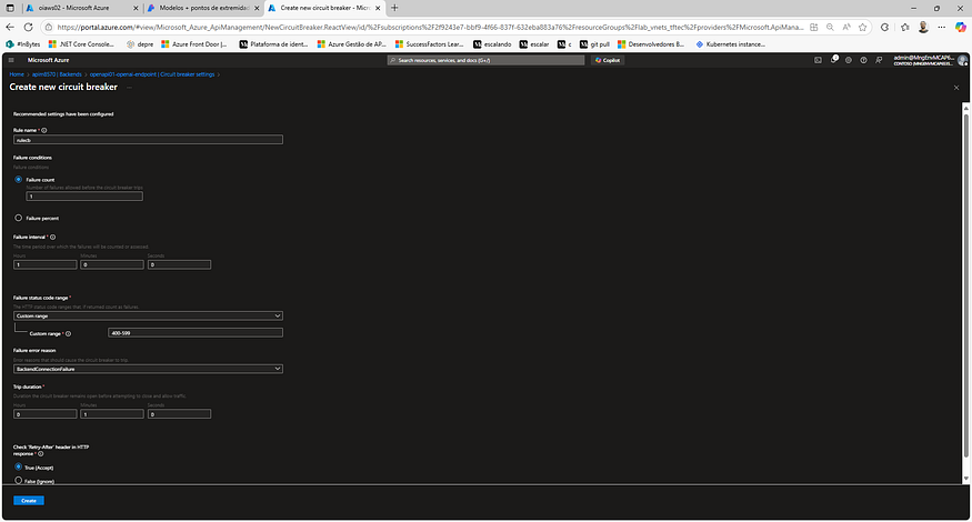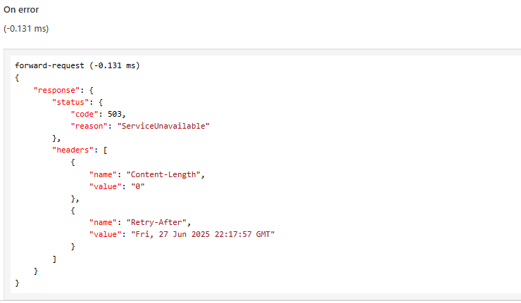 Em seguida, habilitamos o Circuit Breaker, que detecta falhas consecutivas e "abre o circuito", impedindo que novas requisições sejam enviadas a um backend com problemas. Nesse estado, o APIM passa a responder com 503 – Service Unavailable, incluindo o header Retry-After, até que o backend se recupere.