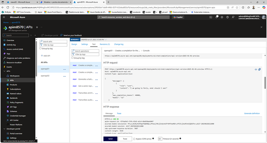 }Teste no console do APIM confirmando resposta 200 OK do Azure OpenAI (modelo o1) via Managed Identity.