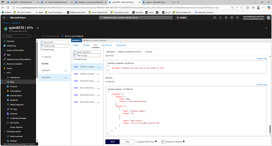 Com os backends e a autenticação configurados, o próximo passo é validar que tudo funciona. Um teste simples direto no console do APIM confirma a conectividade: