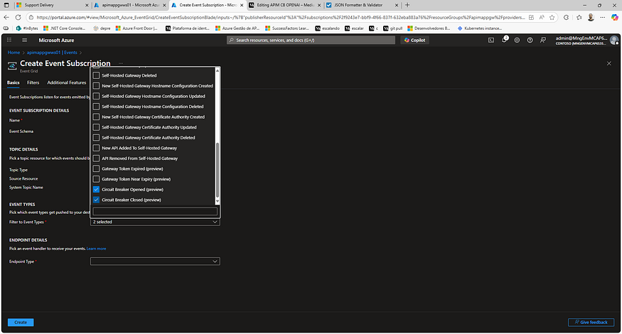 Criação da Event Subscription no Event Grid com os tipos "Circuit Breaker Opened" e "Circuit Breaker Closed" selecionados para capturar eventos de abertura e fechamento do circuito.