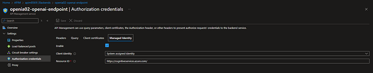 Para que o APIM consiga se autenticar nos backends sem expor chaves de API, configuramos Managed Identity. O Azure API Management pode apresentar credenciais ao backend utilizando cabeçalhos de autorização, parâmetros de consulta ou certificados de cliente — mas a abordagem mais segura e moderna é usar a identidade gerenciada.