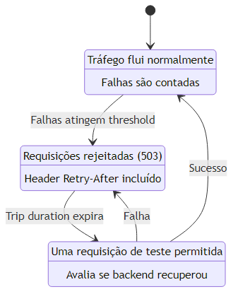 | Open (Aberto) | Todas as requisições são imediatamente rejeitadas com 503 Service Unavailable + header Retry-After. Nenhuma chamada chega ao backend. | Disjuntor desligado — energia cortada para proteger o circuito. |