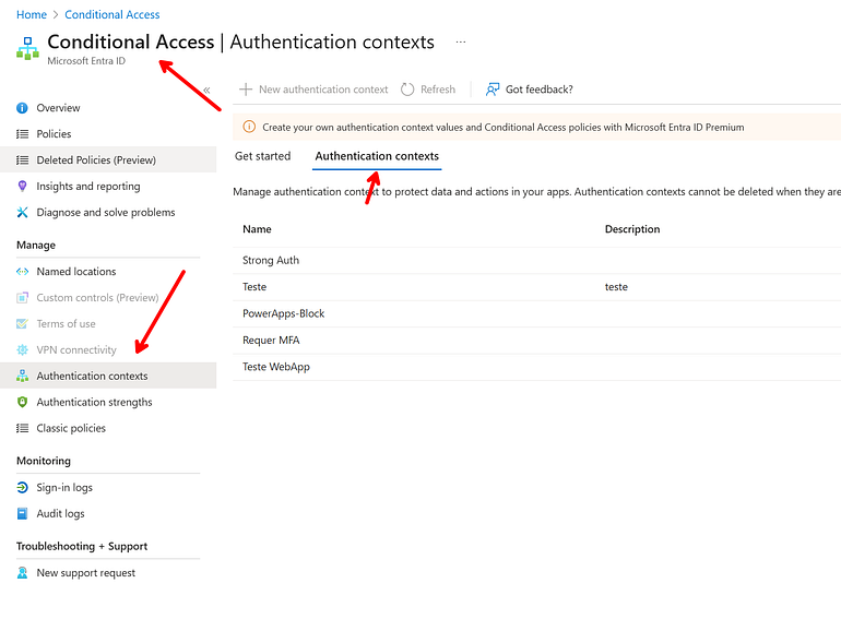 A novidade está na configuração de contextos, que são pares chave-valor criados no Entra ID e utilizados em políticas de acesso condicional.