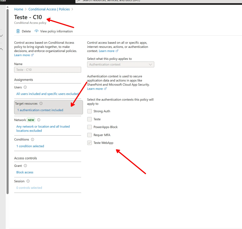Por fim, o contexto é vinculado a uma política de acesso condicional. No exemplo abaixo, a policy "Teste - C10" associa o contexto "Teste WebApp" como target resource: