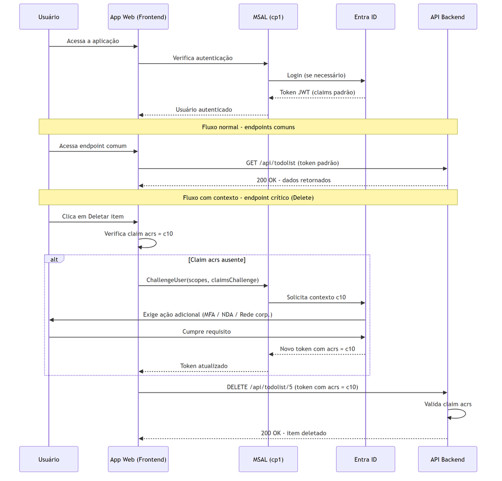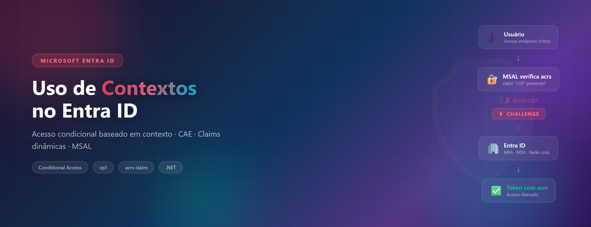 Neste artigo vou detalhar todo o processo, desde a habilitação do Continuous Access Evaluation (CAE), passando pela configuração dos contextos e das políticas de acesso condicional no portal do Entra ID, até a integração prática com uma aplicação .NET dividida em frontend web e API de backend. No código, veremos como o MSAL intercepta o fluxo, verifica se o token contém a claim acrs com o contexto exigido e, caso não contenha, dispara um challenge que leva o usuário de volta ao Entra ID para cumprir o requisito adicional. Se o contexto já estiver satisfeito, o fluxo é transparente para o usuário.