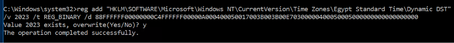 reg add "HKLM\SOFTWARE\Microsoft\Windows NT\CurrentVersion\Time Zones\Egypt Standard Time\Dynamic DST" /v 2023 /t REG_BINARY /d 88FFFFFF00000000C4FFFFFF00000A000400050017003B003B00E70300000400050005000000000000000000