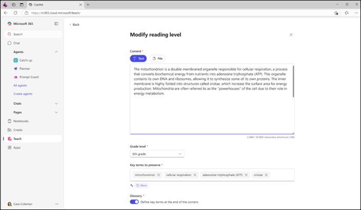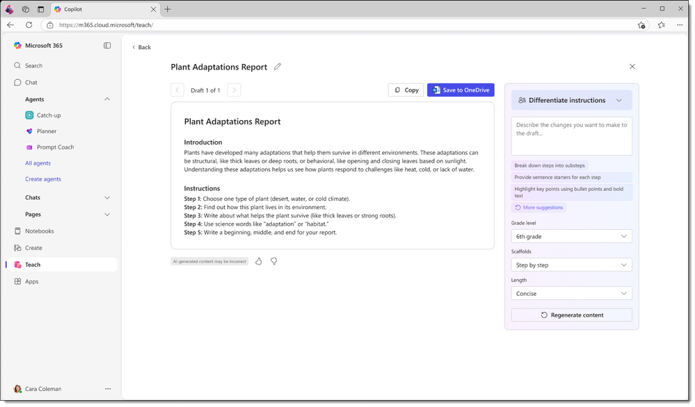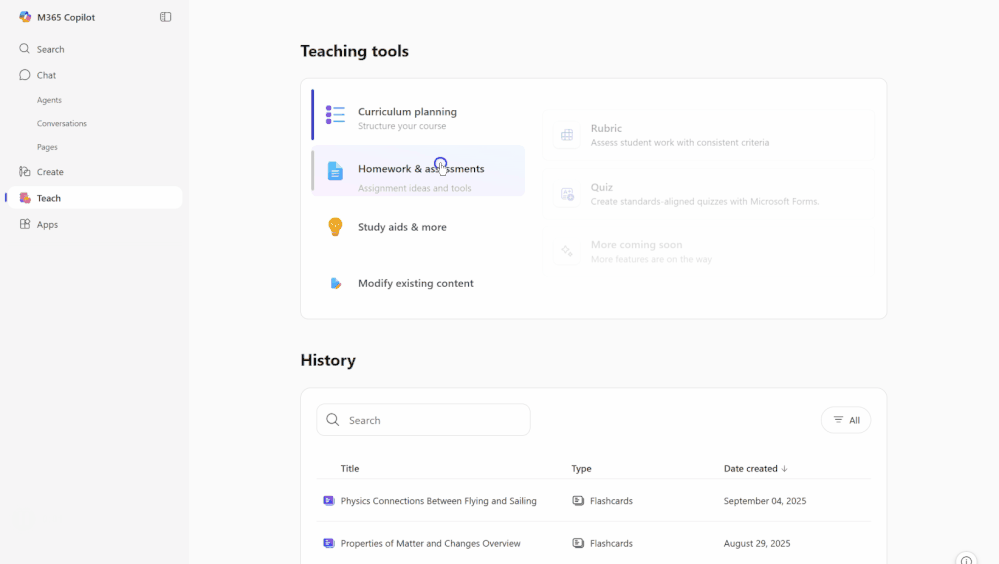 We recently introduced the updated Microsoft 365 Copilot app, your hub for the latest AI functionality. Now, we are bringing AI-powered features to all educators with Teach in the Microsoft 365 Copilot app. In one place, educators can easily create lesson plans, draft materials like quizzes and rubrics, and quickly make modifications like adjust reading levels, differentiate instructions, and align to relevant standards. As we continue to add more AI value in education, it will surface in the Teach module.