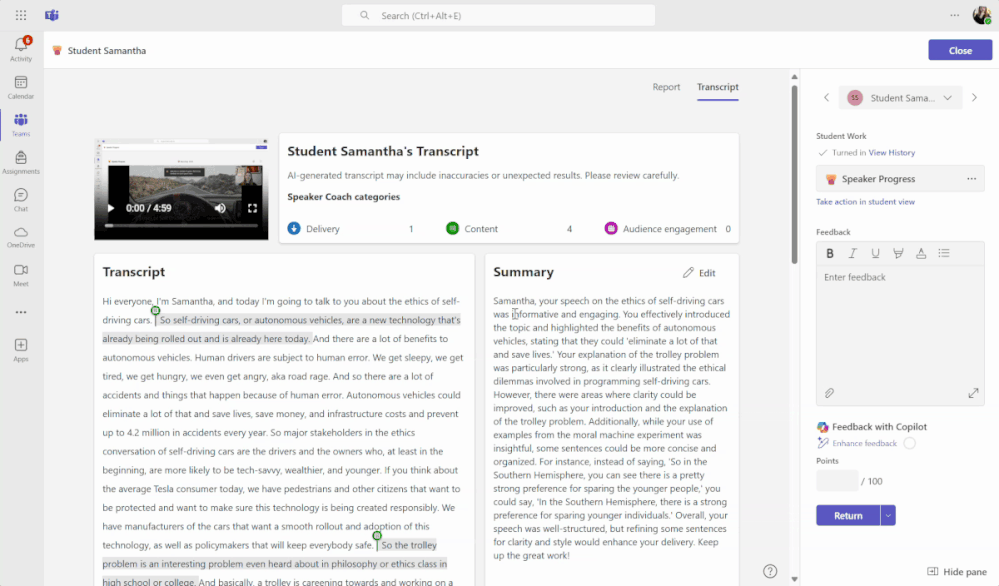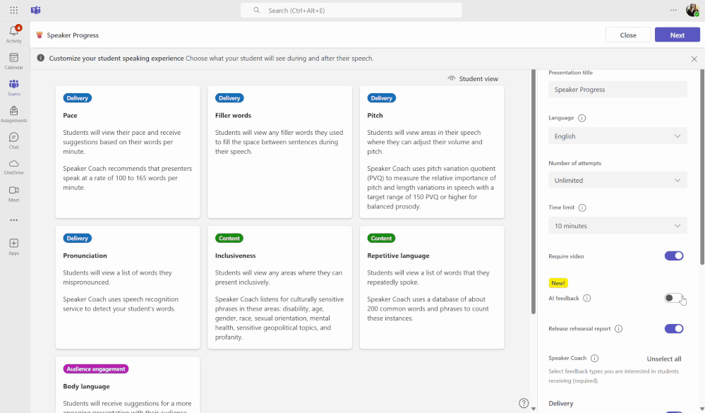 We are excited to share our new narrative AI feedback feature in Speaker Progress is now fully rolled out to all users! We are bringing generative AI to Speaker Progress to give students robust feedback on their speeches. Educators can choose to enable AI feedback, select a speech type, and evaluation criteria. Student speeches will then receive summary feedback and in line comments to help them improve the content and qualitative aspects of their presentations. The educator is fully in control and must review AI Feedback before it is shared with students.