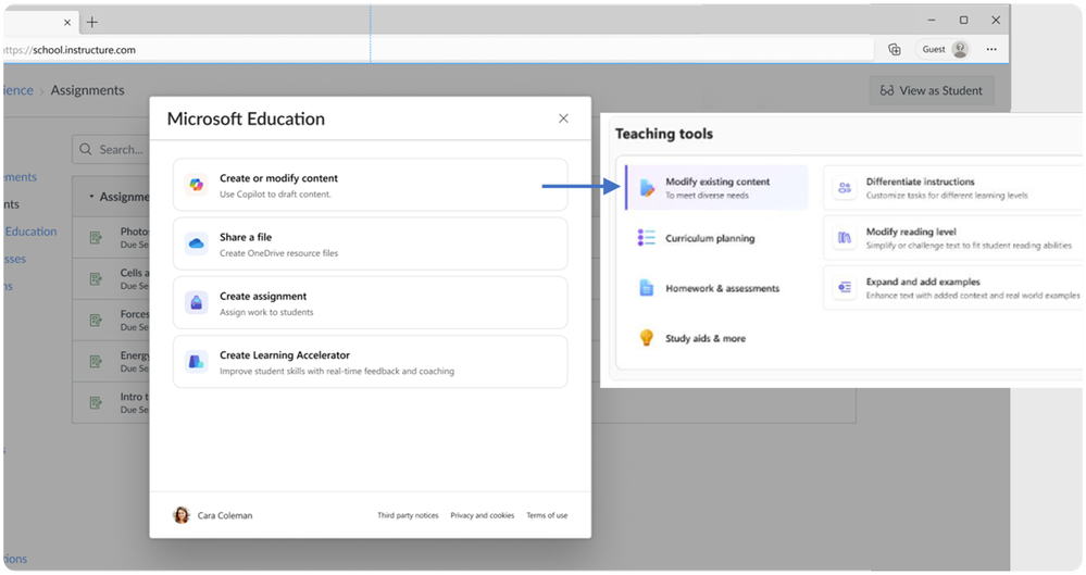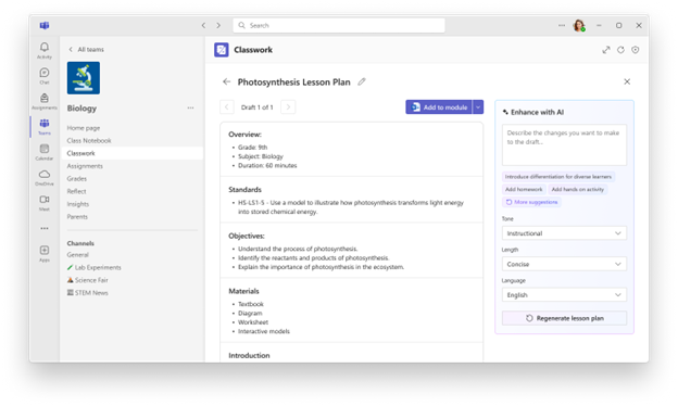The new Microsoft 365 LTI brings Microsoft 365 for Education capabilities for learning management systems (like Canvas, PowerSchool Schoology, Blackboard, Moodle, D2L Brightspace) together into a single tool and streamlined user experience. Educators will be able to Create with AI, which makes features from Teach accessible in Learning Management Systems. This will include Lesson plans, Minecraft lessons, modifying content, rubric and instructions generation, suggested feedback, quiz creation, and more.