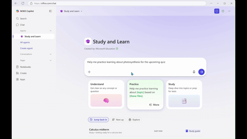 Bring the interactive, conversational Study and Learn Agent in the Microsoft 365 Copilot App to your students. Study and Learn helps learners understand concepts, practice skills with activities like flashcards, and prepare for tests with study guides and quizzes. Additional activities including fill-in-the-blanks, matching, and others that will continue to be added.